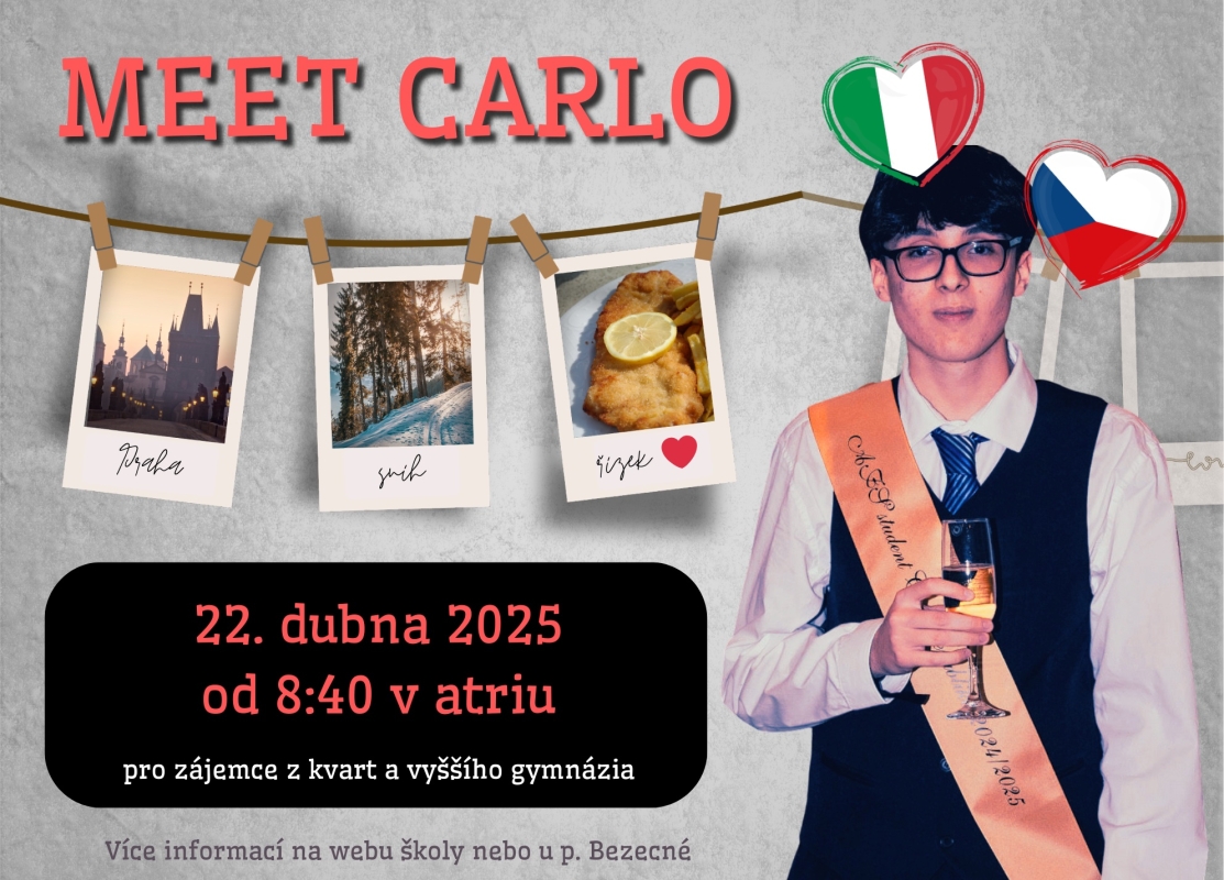 Náš dočasný student Carlo Costanzo, o němž jste četli v rozhovoru v nedávném článku, má zkušeností a postřehů na rozdávání a rozhodl se o vše, co mu pobyt v Česku přinesl, podělit v rámci besedy konané 22. 4. od 8:40 v atriu školy.