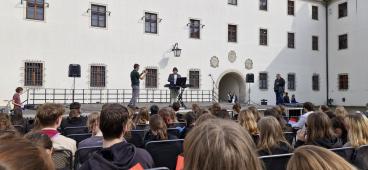 Po obědě jsme zamířili na slavnostní zahájení na hradě Špilberk, kde jsme pod vedením uměleckého ředitele GYMNASIA CANTANT doc. Mgr. et MgA. Jana Ocetka, Ph.D. zazpívali spolu s ostatními sbory hymnu této soutěže a také skladbu V Brně na placu. Stali jsme se tak součástí největšího gymnaziálního sboru na světě (cca 500 zpěváků). Po prohlídce hradu nás čekala další akce, Koncert Sbory sborům. Každý sbor se představil jednou skladbou a my jsme si tak mohli poslechnout naši konkurenci. Jak jsme zjistili, soutěžili jsme proti úžasným sborům.