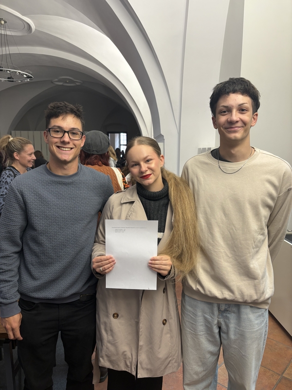 Katedra dějin umění na Filozofické fakultě Univerzity Palackého v Olomouci organizuje pro studenty středních škol už několikerým rokem Uměleckohistorickou olympiádu. Vědomostní soutěž je určena všem středoškolákům, kteří se zajímají o výtvarné umění a kulturní dějiny od antiky až po dnešní dobu a chtějí si porovnat znalosti se svými vrstevníky. A z našeho gymnázia se již potřetí do Olomouce vypravila skupina tří odhodlaných studentů z 4A4, Venduly Nohelové, Jakuba Nováka a Ondřeje Koloničného, kteří se ve svém volném čase na tento nelehký vědomostní test připravili. A přestože v náročné konkurenci soutěžících převážně z odborných uměleckých škol na oceněné posty nedosáhli, jejich výsledky jsou hodny pochvaly - Vendula se umístila z celkového počtu cca 50 soutěžících na 15. místě, Ondra a Kuba kolem 30. místa. Děkujeme jim za jejich čas a za skvělou reprezentaci naší školy.
