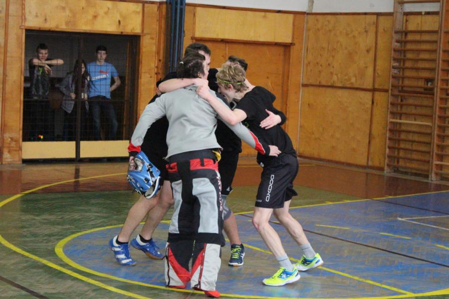 Potom už tedy přišlo na řadu finále. Atmosféra v tělocvičně gradovala a všichni s napětím očekávali, jak to všechno dopadne. Proti sobě se postavily třídy 4A4, vedena hlavní florbalovou ikonou naší školy Vášou Jurdzinem, a 6A8, jež svými nekompromisními výsledky naznačovala, že bude chtít překazit útok 4A4 na zlatý hattrick. Do zápasu vstoupila aktivněji sexta, jež si díky rychlému pohybu vypracovávala více šancí a brzo se ujala vedení 2:0. Potom kluci z 4A4 zabrali a odměnou jim bylo snížení na 1:2. Od tohoto okamžiku se obraz zápasu začal otáčet a najednou to byla 4A4, která měla více ze hry. Za chvíli to už bylo 2:2 a tlak 4A4 neustával, naopak vyústil ve vedoucí gól na 3:2. Už to vypadalo, že si 4A4 dojde pro vítězství, to by však nesměl Hynek Žmolík po sebevědomém průniku a následném natlačení před Halamíčkovu branku vyrovnat. Utkání šlo tedy do prodloužení a čekalo se na zlatý gól. Oba týmy, vědomy si důležitosti okamžiku, začaly velmi opatrně, po minutě hry však dostal více prostoru na pravém křídle hráč ze 4. A Vítek Valenta a nejkrásnější střelou dne vymetl pavučinky ze vzdálenější šibenice Zerzoňovy svatyně. Po tomto gólu tak započaly oslavy triumfu 4A4, okořeněné ziskem zlatého hattricku.