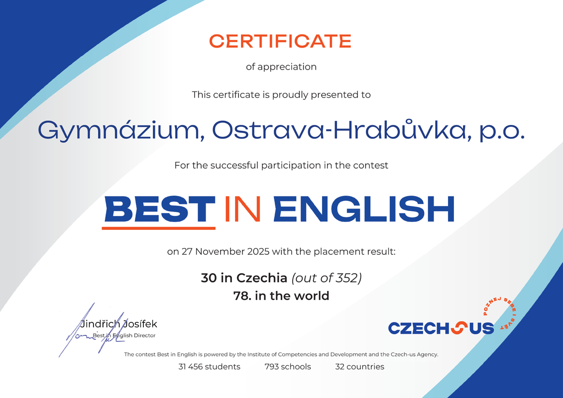 Ve čtvrtek 27. 11. 2025 proběhl již třináctý ročník mezinárodní online soutěže v anglickém jazyce Best in English, určené středoškolákům ve věku 14–20 let. Organizátorem soutěže je Institute for Competencies Development (ICD) ve spolupráci s agenturou Czech-us a dalšími partnery.