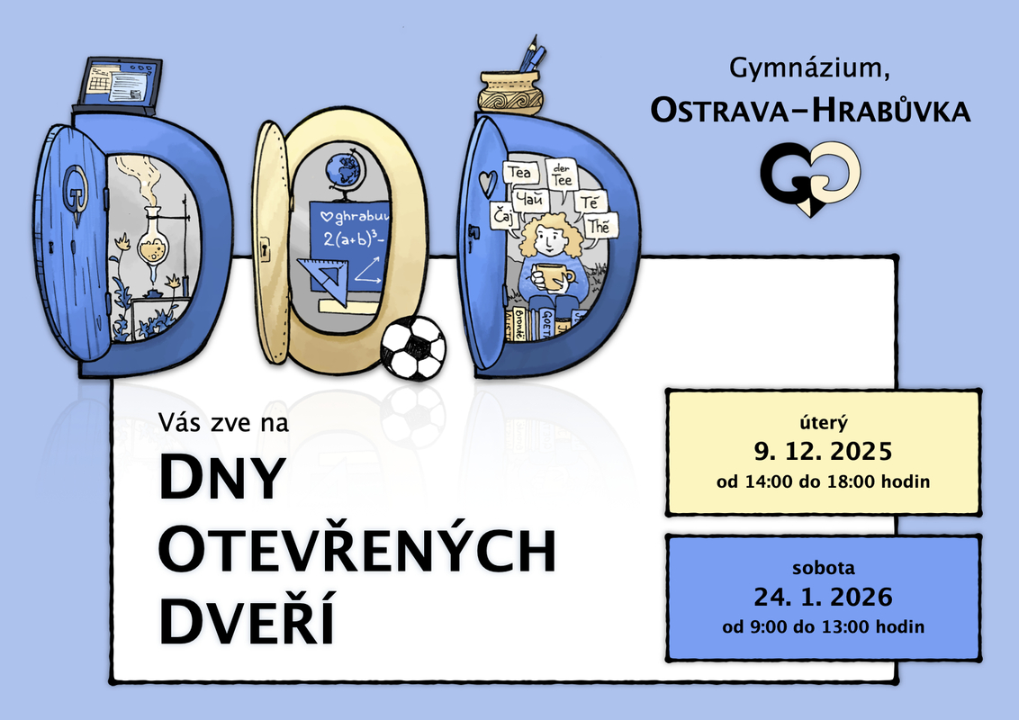 Všechny zájemce o studium na našem gymnáziu srdečně zveme na dny otevřených dveří, které proběhnou ve středu 9. 12. 2025 od 14 do 18 hod. a v sobotu 24. 1. 2026 od 9:00 do 13:00 hod. Školou vás provedou naši studenti, kteří vám jistě rádi prozradí vše o chodu naší školy, odtajní všechny aktivity, na které se u nás můžete těšit. Paní ředitelka vás provede celým děním ohledně přijímacích zkoušek, přípravných kurzů, zodpoví všechny vaše zvídavé dotazy. A co vás čeká víc? Neprozradíme. Přijďte se podívat sami!