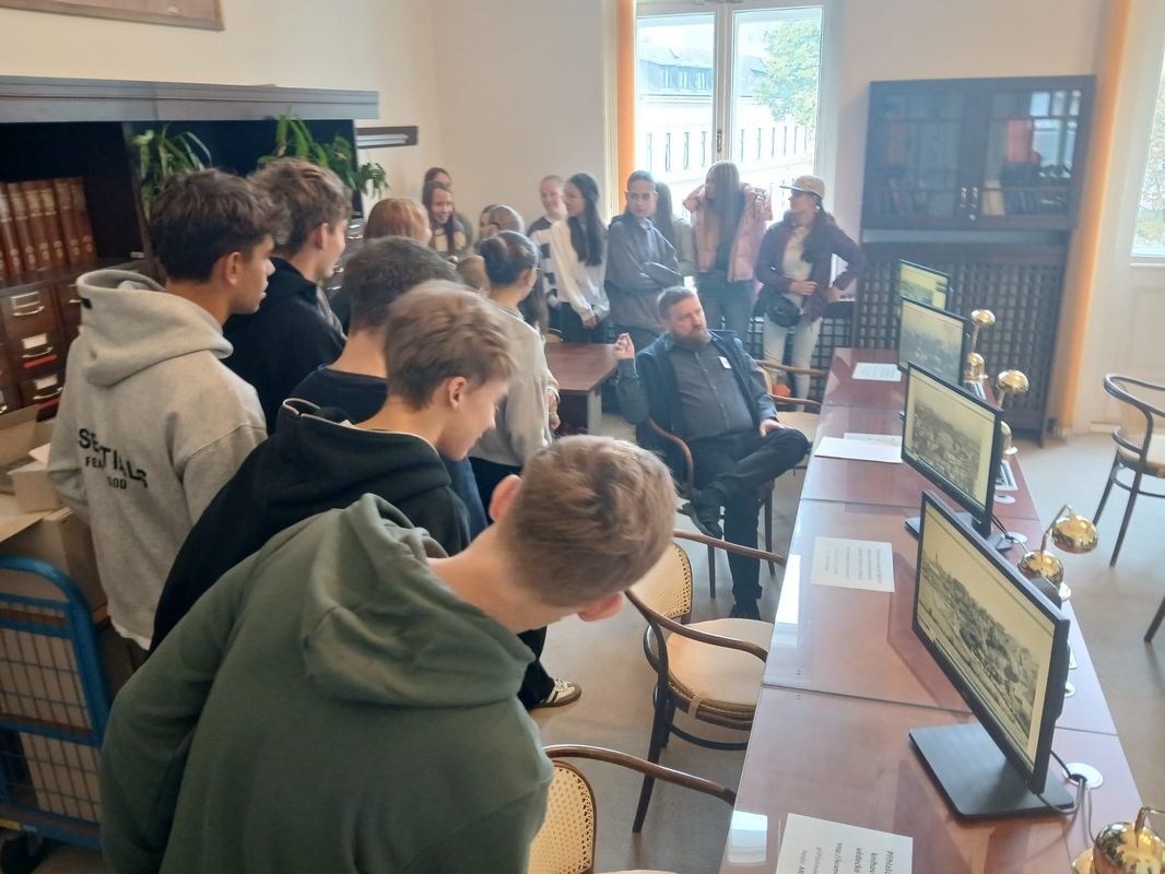 V říjnu se studenti prvního ročníku a kvinty A účastnili zajímavé exkurze, která dokumentovala historii našeho města. Pan průvodce gymnazistům poodhalil, v čem spočívá práce historika, k čemu slouží a v minulosti sloužila instituce (archiv) a jaká je její struktura. K vidění byly vzácné listiny, např. ta, kterou vydal našemu městu císař Karel IV., dále katastrální mapy, kroniky či staré pečetě a pečetidla ze 17. století. Po úvodní přednášce jsme se s panem archivářem vydali do badatelny a studovny, kde jsme měli možnost vyzkoušet si vyhledávání materiálů v digitalizované podobě. Na závěr exkurze čekala studenty prohlídka depozitáře.