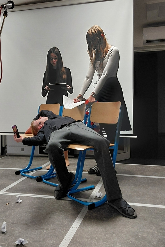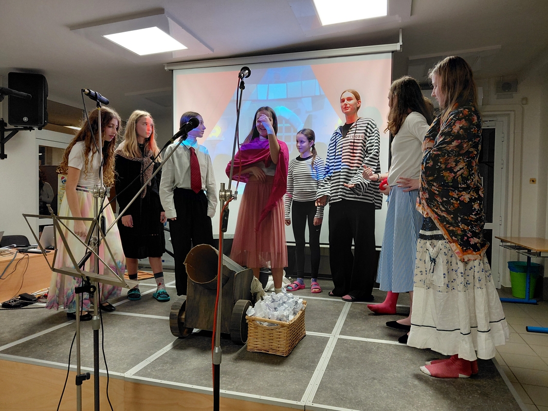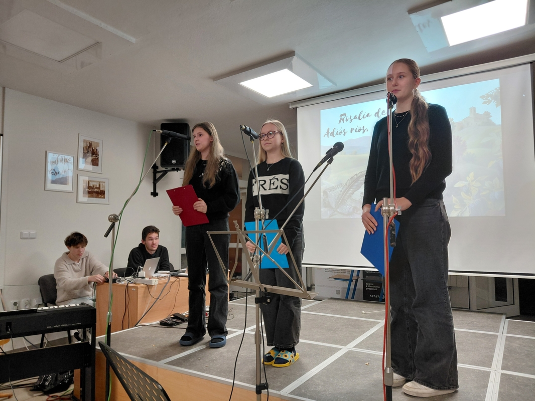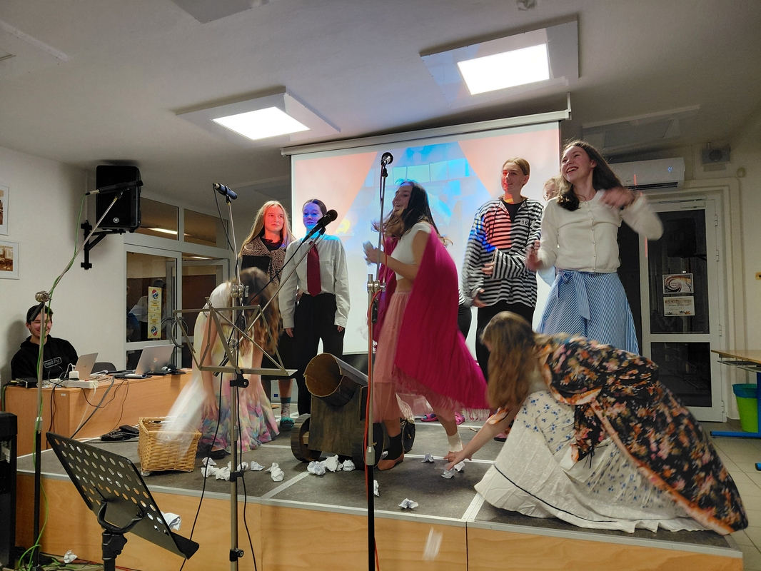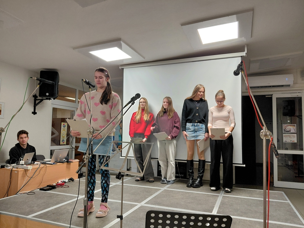 Pěvecký sbor Luminis to rozparádil skladbami Osvobozeného divadla i lidovkami, o divadelní kousky se postaral dramatický kroužek svým soubojem s rádoby koučem, maturanti předvedli seanci u psychologa a studenti tercie A bravurně obsluhovali svou Těžkou Barboru v městečku Mozzarella. To vše ve verších. A verše zazněly i v podání dalších studentů napříč ročníky, ať už se jednalo o Křišťálovou studánku (zvládnutou i v rytmu rapu), podzimní básně, několikajazyčný přednes či třeba Bulata Okudžavu. Hra na tubu či elektrickou kytaru dala programu i hudební rozměr. A že ke kultuře patří třeba i zákusek, smlsli jsme si i na něm v podání studentů kvarty B.