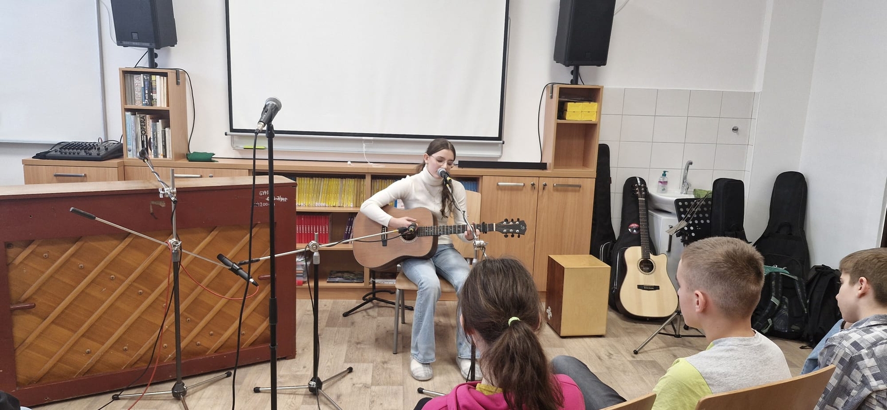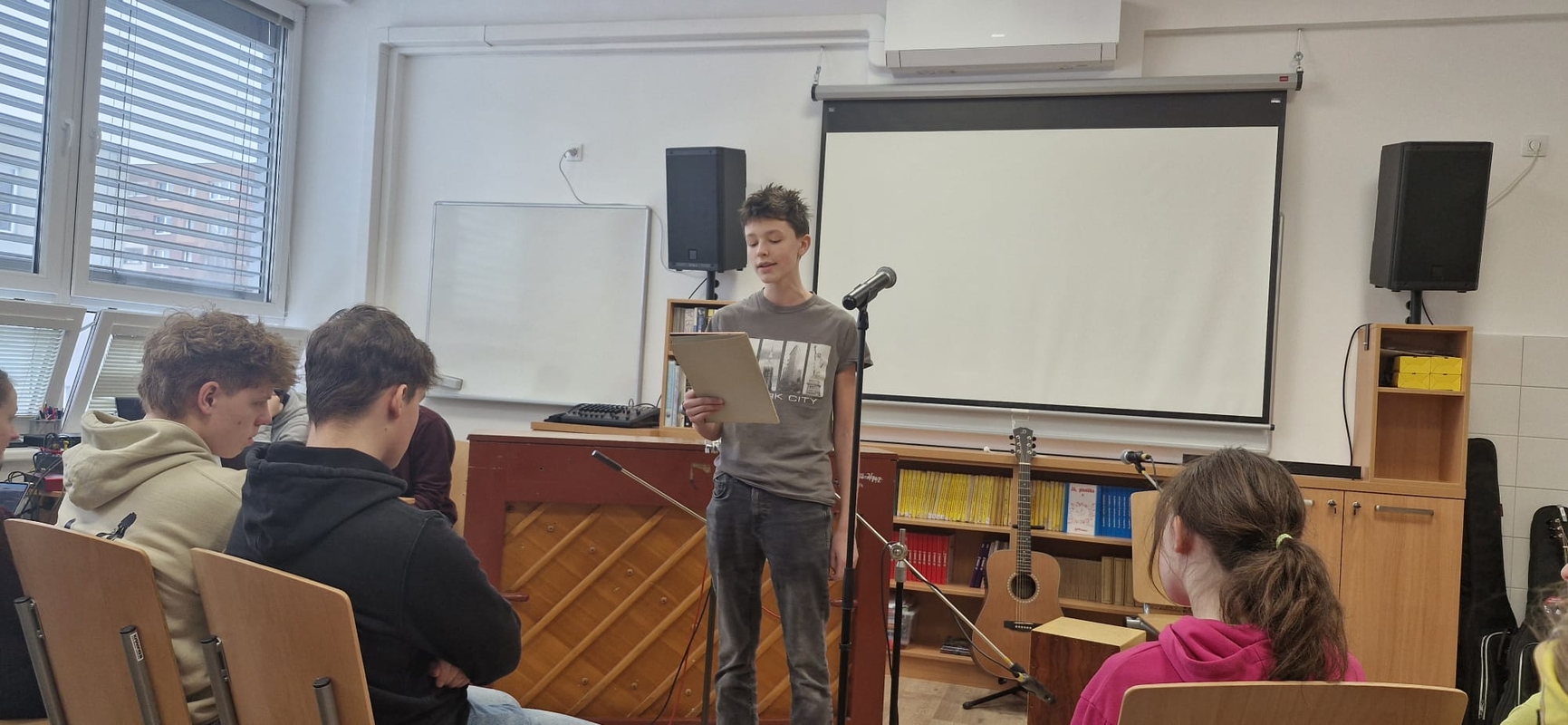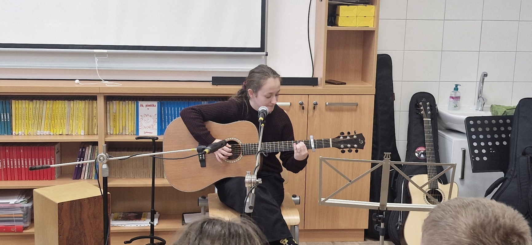 Nejlepší zpěváci naší školy pokřtili novou hudebnu! Nikoliv šampaňským, ale svými úžasnými a mnohdy zcela profesionálními pěveckými a instrumentálními výkony.