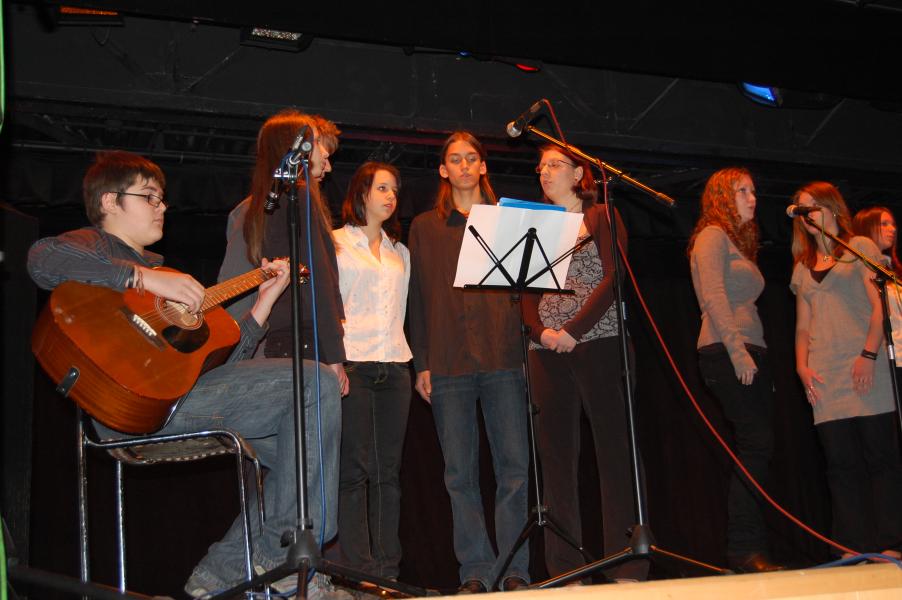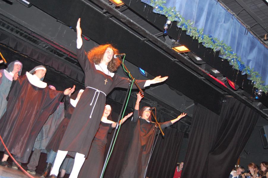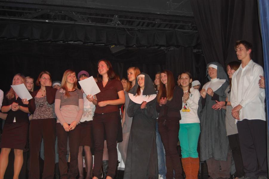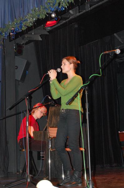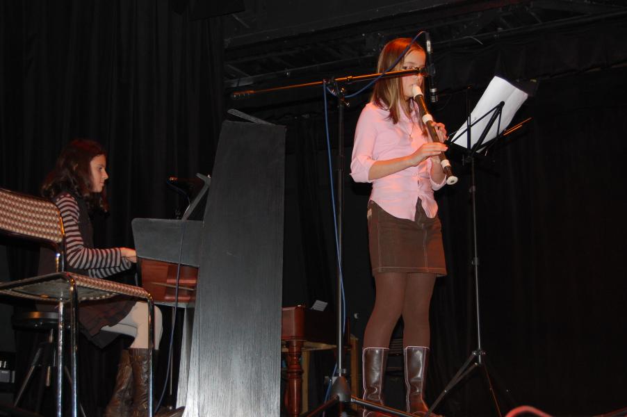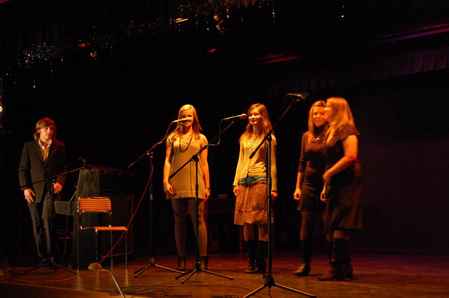 Příjemnou předvánoční atmosféru navodila již v úvodu několika lidovými písněmi Cimbálová muzika Fojt, která působí při ZUŠ v Brušperku a v níž zpívá a hraje na flétny a klarinet student 1. ročníku Jakub Choleva. Následně nás sólovým zpěvem písně Who I Am zaujala Bára Hankusová z 3A8. Sborová pěvecká vystoupení jsme slyšeli nejen od Školního pěveckého sboru, který se představil písněmi More Thaw Words a Tam, kde sa neumiera (sóla Eva Konečná, 5B8 a Adéla Kocmánková, 5B8, kytarový doprovod David Mejta, 1A4 a Robert Mareš, 5B8), ale také v podání studentek z 6B8, které v zajímavé úpravě písně Mad World doprovodil na klavír Matěj Kapošváry. Ani studenti z 5B8 se nenechali zahanbit a pod odborným dohledem Mgr. Evy Mittnerové nacvičili populární gospel I Will Follow Him, který jsme si vyslechli za klavírního doprovodu Antonína Sedláře. Sólo si vystřihl, v kostýmu jeptišky neodolatelný, Tomáš Prostějovský. Jejich vystoupení mělo velký zasloužený ohlas. Studenti ze tříd 5A8, 6A8 a 7A8 ukázali své pěvecké a instrumentální umění prostřednictvím židovské lidové písně Chalom chaverim s úvodním flétnovým sólem Báry Vachtové a spirituálu Starý příběh, který na kytaru doprovodil Tomáš Vilím. Jako sólistky se představily Kateřina Kůřilová, Gabriela Hercíková, Karolína Svrčinová a Klára Miklasová. Nejmladšími účinkujícími byly slečny z 1B8, Karolína Kuchařová a Kateřina Skupníková, které na klavír a altovou flétnu zahrály píseň Marty Kubišové Balada s Bohem Panem. Velmi nás potěšila přítomnost loňského maturanta Tomáše Oramuse. Spolu se svým hostem se na jevišti opět předvedl jako výborný klavírista.